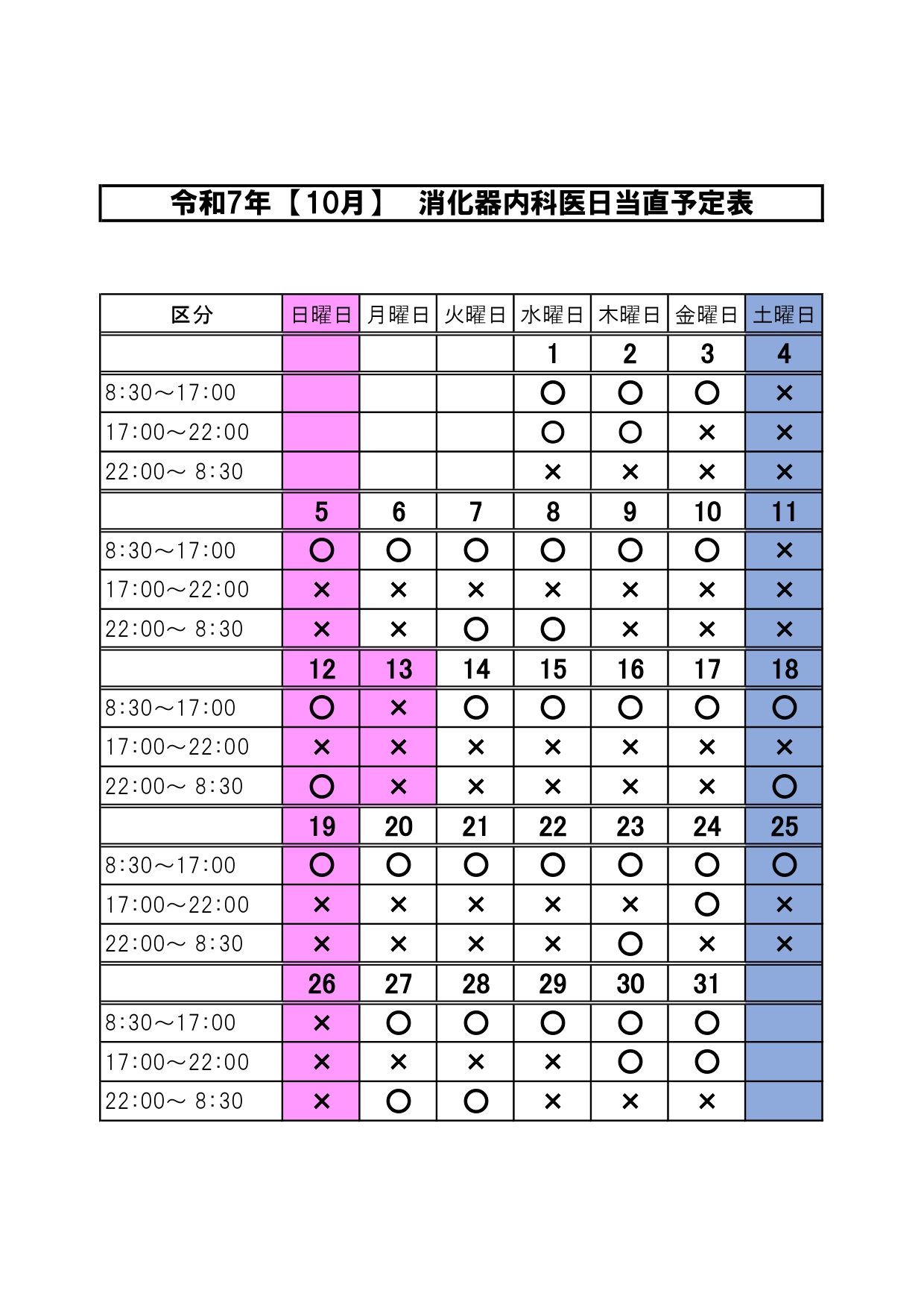 2025年09月29日(月) お知らせ 医療機関のみなさまへ(緊急内視鏡の依頼について) 緊急内視鏡治療を必要とする患者さんのご紹介は、必ず事前にお電話で診療可能であるか をご確認の上、患者さんをご紹介ください。 消化器内科医が日当直を担当する日(○のついた日)であっても、処置中等で患者さんを お受けできない場合があります。 表はクリックすると拡大します 新着情報一覧