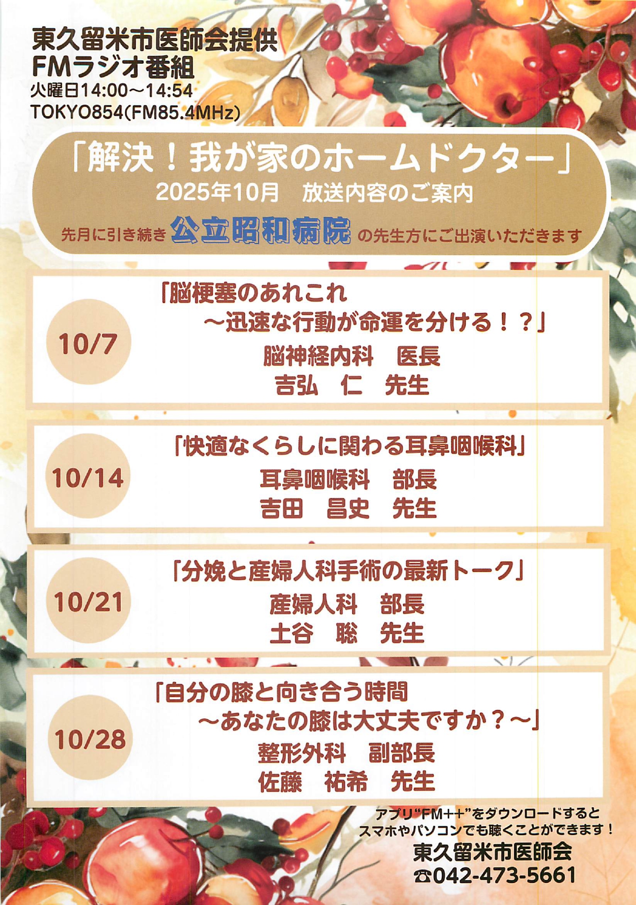 東久留米市医師会提供のFMラジオ番組(TOKYO854(FM85.4MHz)火曜日14:00~14:54)で放送される「解決!我が家のホームドクター」に、当院の医師が出演します。