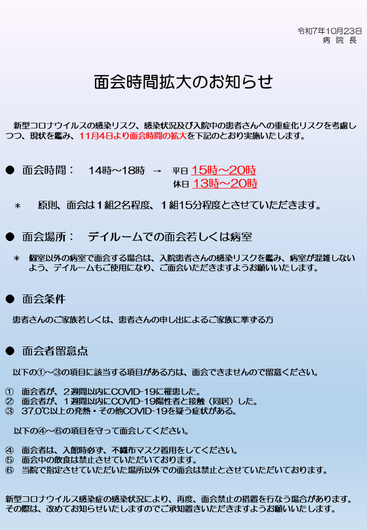 2025年10月23日(木) お知らせ 面会時間拡大のお知らせ 新型コロナウイルスの感染リスク、感染状況及び入院中の患者さんへの重症化リスクを考慮しつつ、現状を鑑み、11月4日より面会時間の拡大をいたします。 詳しくは、下記ポスターをご覧ください(クリックすると拡大します)。 新着情報一覧