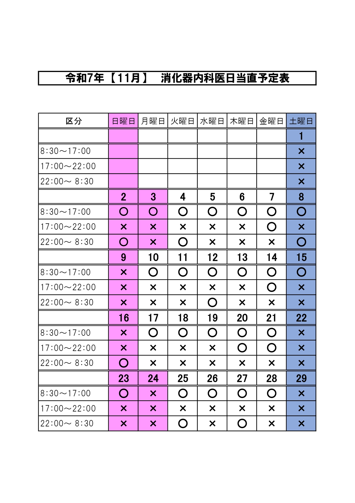 2025年10月30日(木) お知らせ 医療機関のみなさまへ(緊急内視鏡の依頼について) 緊急内視鏡治療を必要とする患者さんのご紹介は、必ず事前にお電話で診療可能であるか をご確認の上、患者さんをご紹介ください。 消化器内科医が日当直を担当する日(○のついた日)であっても、処置中等で患者さんを お受けできない場合があります。 表はクリックすると拡大します 新着情報一覧