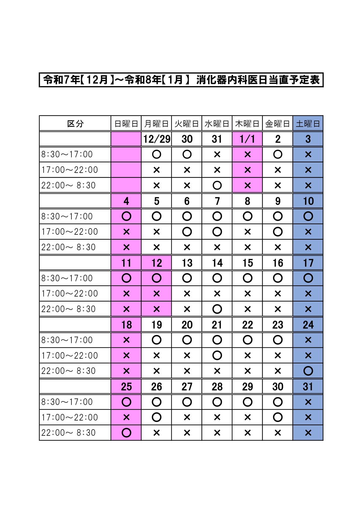 2025年12月26日(金) お知らせ 医療機関のみなさまへ(緊急内視鏡の依頼について) 緊急内視鏡治療を必要とする患者さんのご紹介は、必ず事前にお電話で診療可能であるか をご確認の上、患者さんをご紹介ください。 消化器内科医が日当直を担当する日(○のついた日)であっても、処置中等で患者さんを お受けできない場合があります。 表はクリックすると拡大します 新着情報一覧