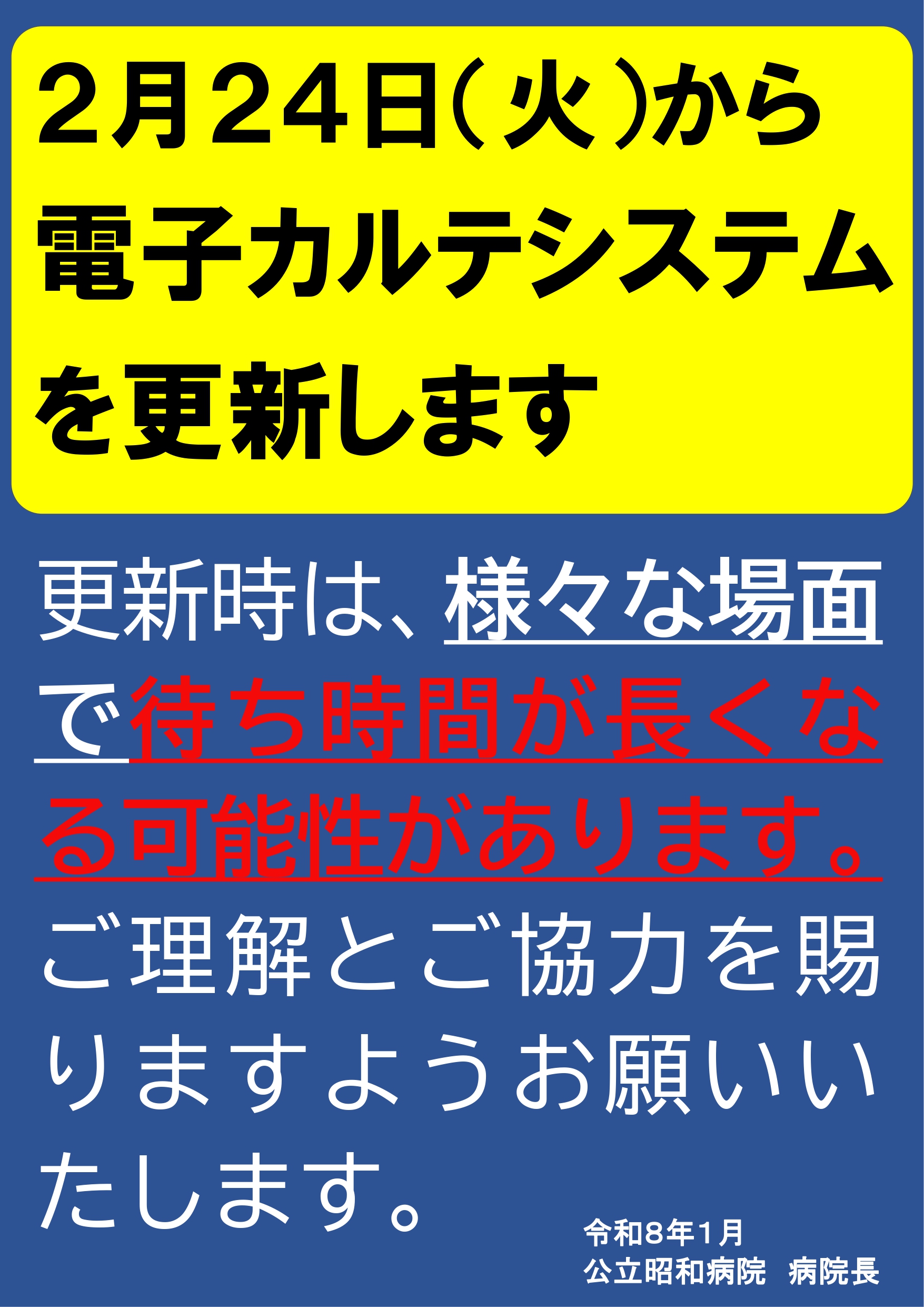 2026年01月30日(金) お知らせ 電子カルテ更新に伴うお知らせとお願い 当院では、医療サービス向上と安全な医療の提供のため、令和8年2月24日(火)から電子カルテシステムを更新します。 更新直後は、受付・診察・会計など様々な場面で待ち時間が長くなる可能性があります。 ご来院される皆様にはご迷惑をおかけいたしますが、ご理解とご協力を賜りますよう何卒よろしくお願いいたします。 公立昭和病院 病院長 表はクリックすると拡大します 新着情報一覧