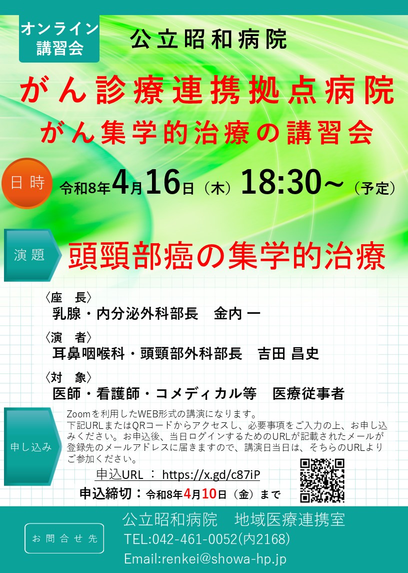 2026年03月04日(水) イベント情報 【4/16(木)】医療従事者向け講習会「頭頸部癌の集学的治療」開催のお知らせ 公立昭和病院では、令和8年4月16日(木)に「頭頸部癌の集学的治療」についての講習会を開催いたします。 詳しくは、以下のチラシをご覧ください。 なお、QRコード・URLを短縮しておりますので、「URLはこちら」のご案内が表示されるまでに、10秒ほどかかります。 ご了承ください。 ※画像はクリックすると拡大されます。 新着情報一覧