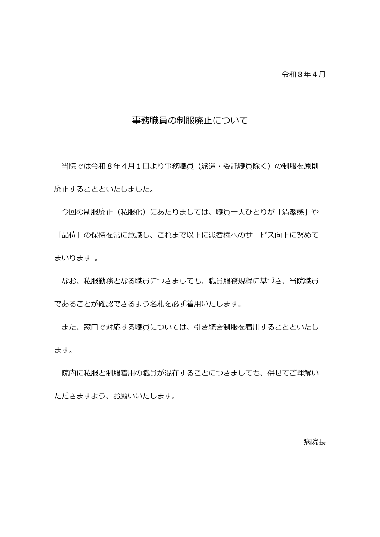 2026年04月01日(水) お知らせ 事務職員の制服廃止について(令和8年4月1日より) 当院では令和8年4月1日より事務職員(派遣・委託職員除く)の制服を原則廃止することといたしました。 今回の制服廃止(私服化)にあたりましては、職員一人ひとりが「清潔感」や「品位」の保持を常に意識し、これまで以上に患者様へのサービス向上に努めてまいります 。 なお、私服勤務となる職員につきましても、職員服務規程に基づき、当院職員であることが確認できるよう名札を必ず着用いたします。 また、窓口で対応する職員については、引き続き制服を着用することといたします。 院内に私服と制服着用の職員が混在することにつきましても、併せてご理解いただきますよう、お願いいたします。 表はクリックすると拡大します 新着情報一覧